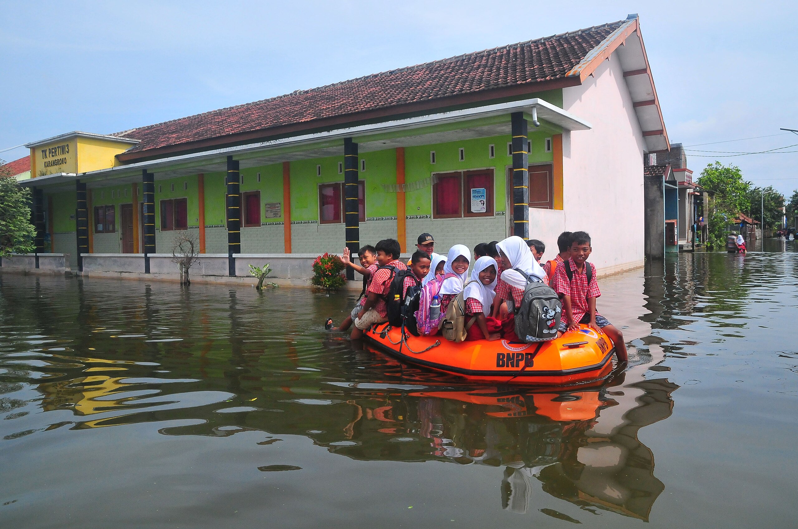 Bahasa Indonesia: Siswa pulang sekolah menggunakan perahu usai mengikuti Ujian Tengah Semester (UTS) di SD N 4 Karangrowo yang tergenang banjir di Desa Karangrowo, Undaan, Kudus, Jawa Tengah, Rabu (1/3/2023). Sebanyak 158 siswa terpaksa melaksanakan UTS di Mushola dan sebagian lainnya di Sekolah dengan halaman yang tergenang akibat banjir yang melanda wilayah itu sejak sepekan terakhir |